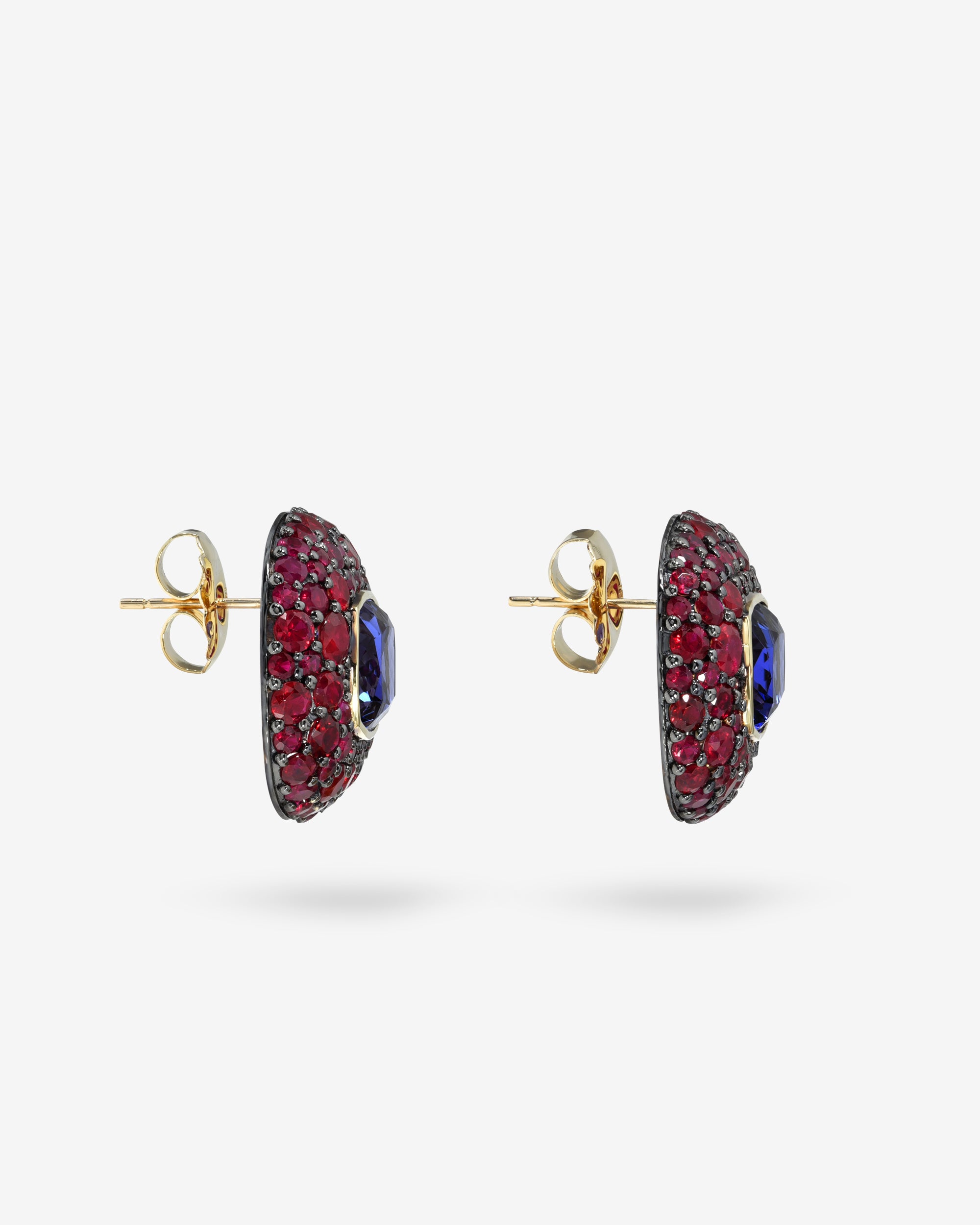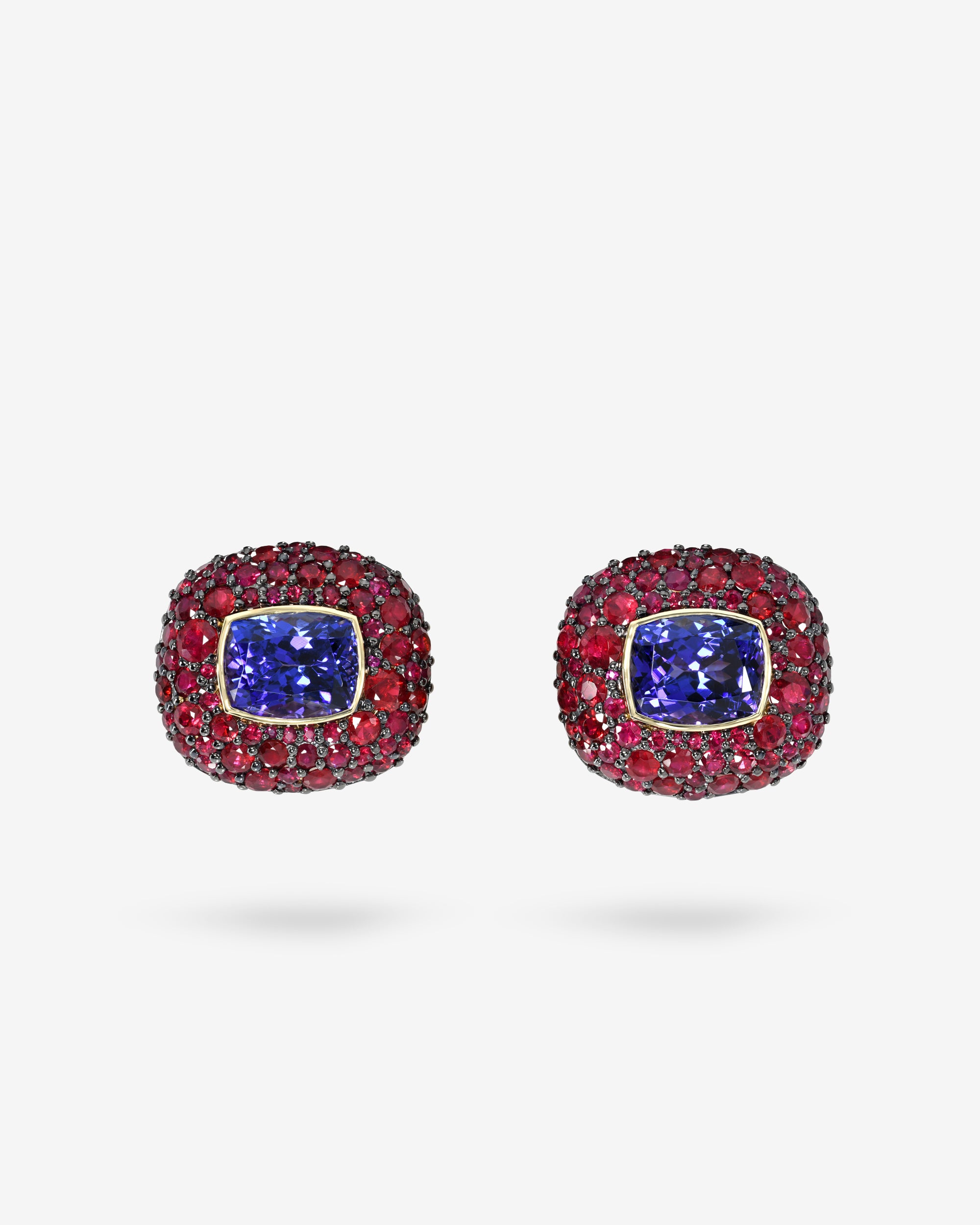 Eye catching earrings featuring stunning cushion-cut tanzanites, framed by a vibrant halo of hand-set rubies. May be worn together with Oursin Necklace.