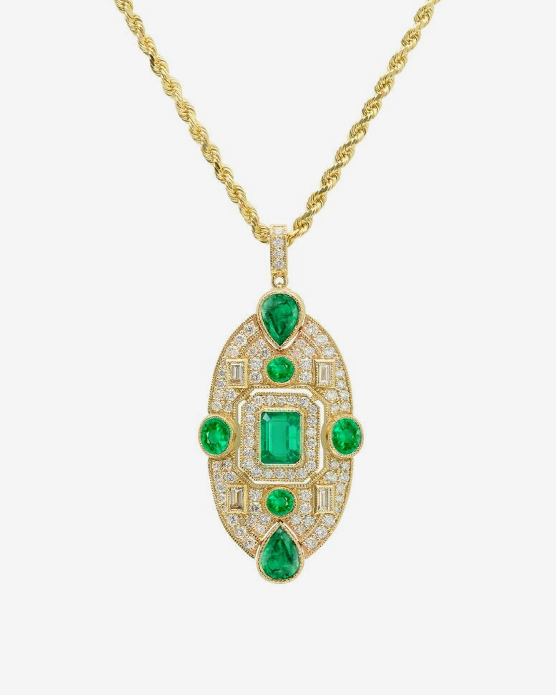 A fresh twist on Art Deco style, the Fideli necklace is a modern masterpiece. With over 90 individually set diamonds, and stunning natural emeralds, this piece catches light in magnificent ways. Can be paired with the matching Fideli Earring and Majeste ring.