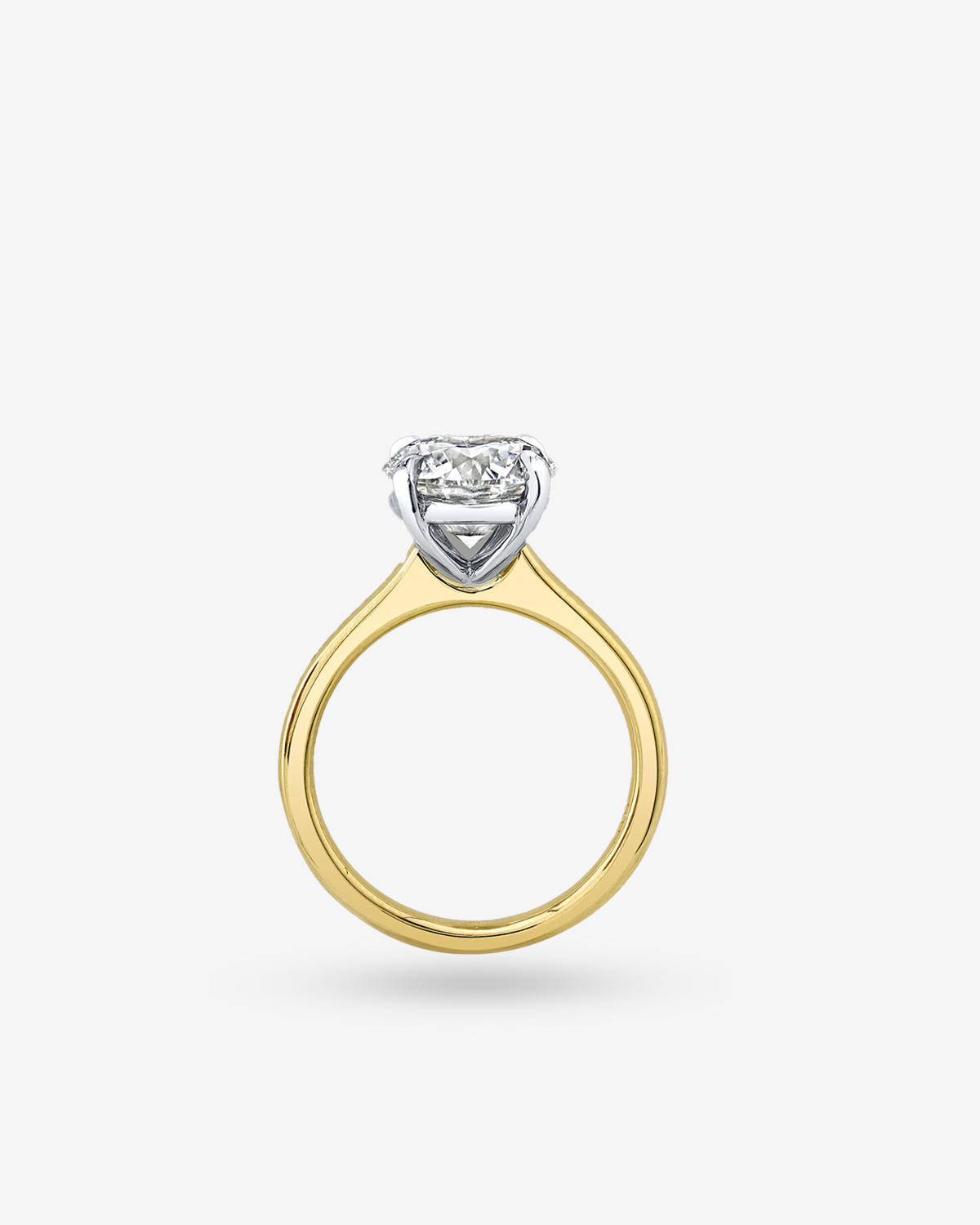 The KCS Knightsbridge Engagement Ring features a center solitaire diamond with a two-toned, closed bezel setting and delicate band. Pictured here with a round cut diamond.