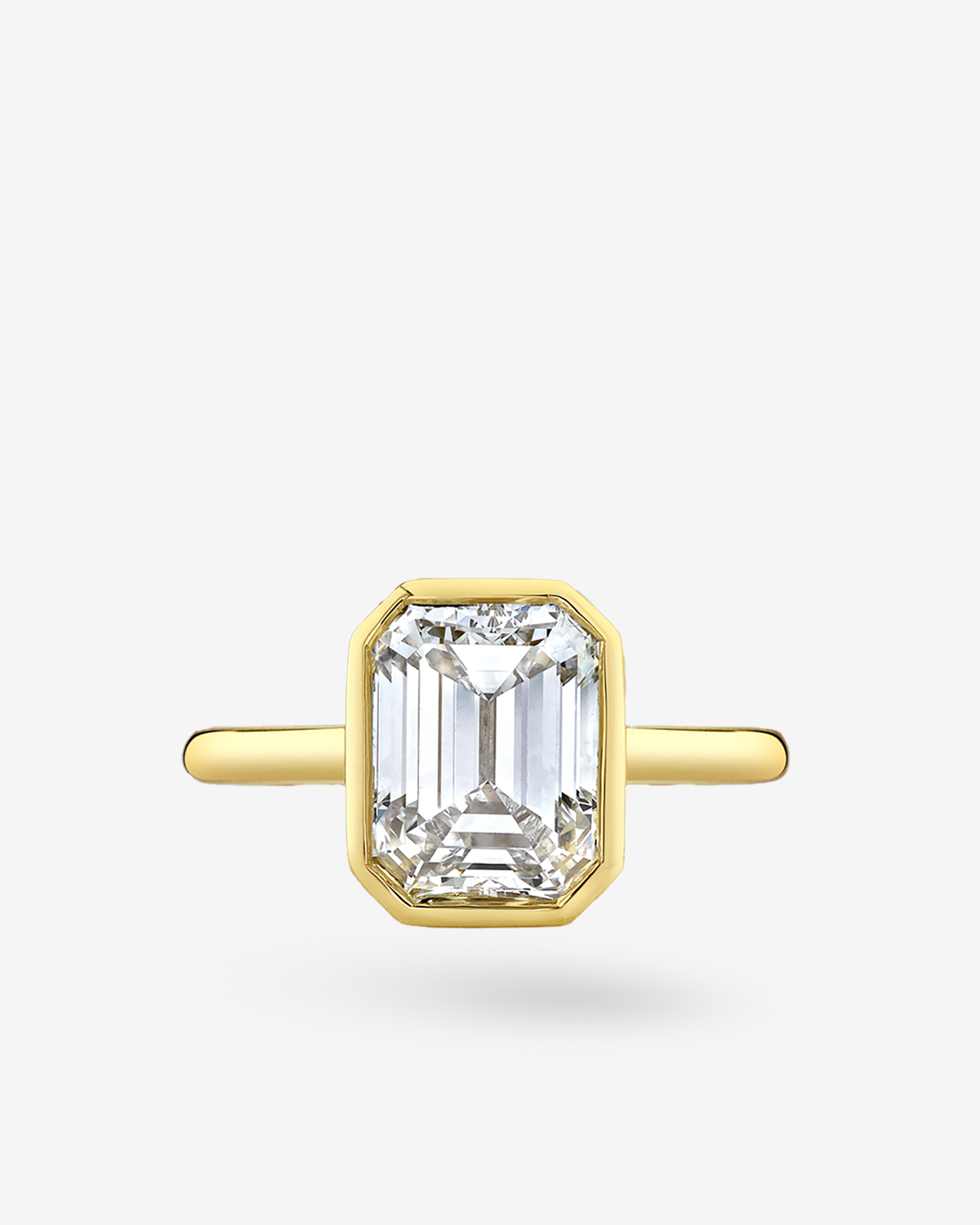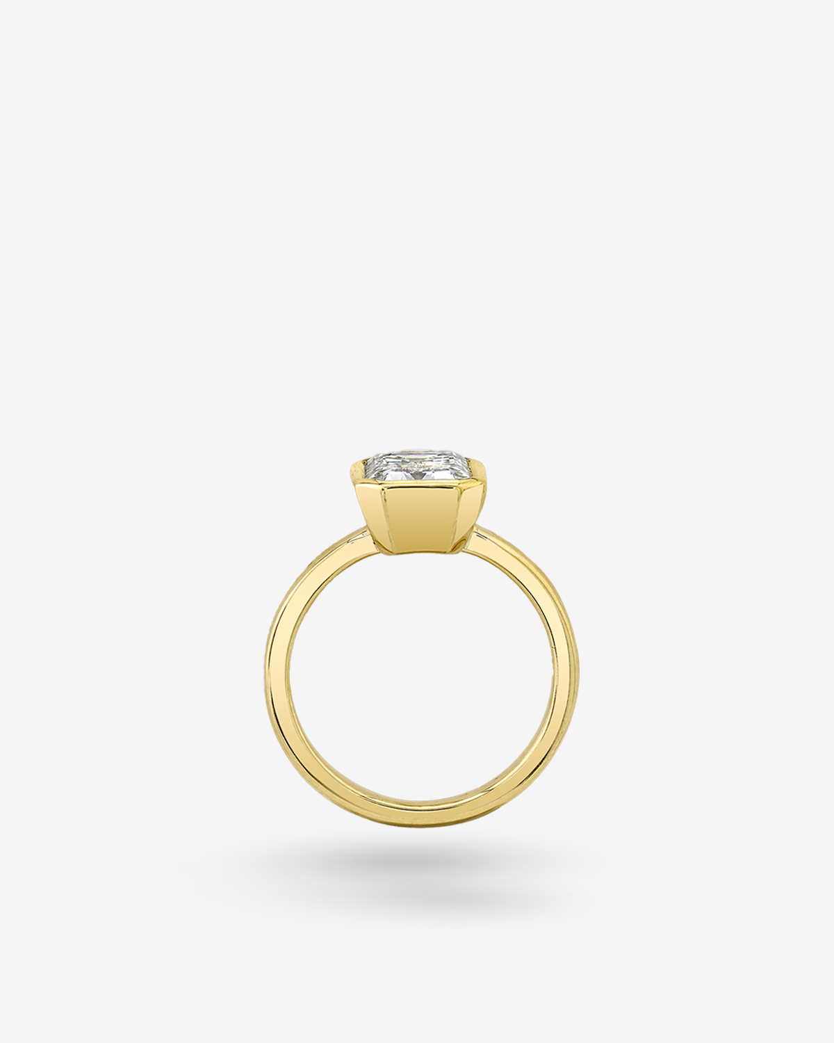The KCS Tivoli Engagement Ring features a center solitaire diamond with a closed bezel setting and a delicate band. Pictured with an emerald cut diamond.