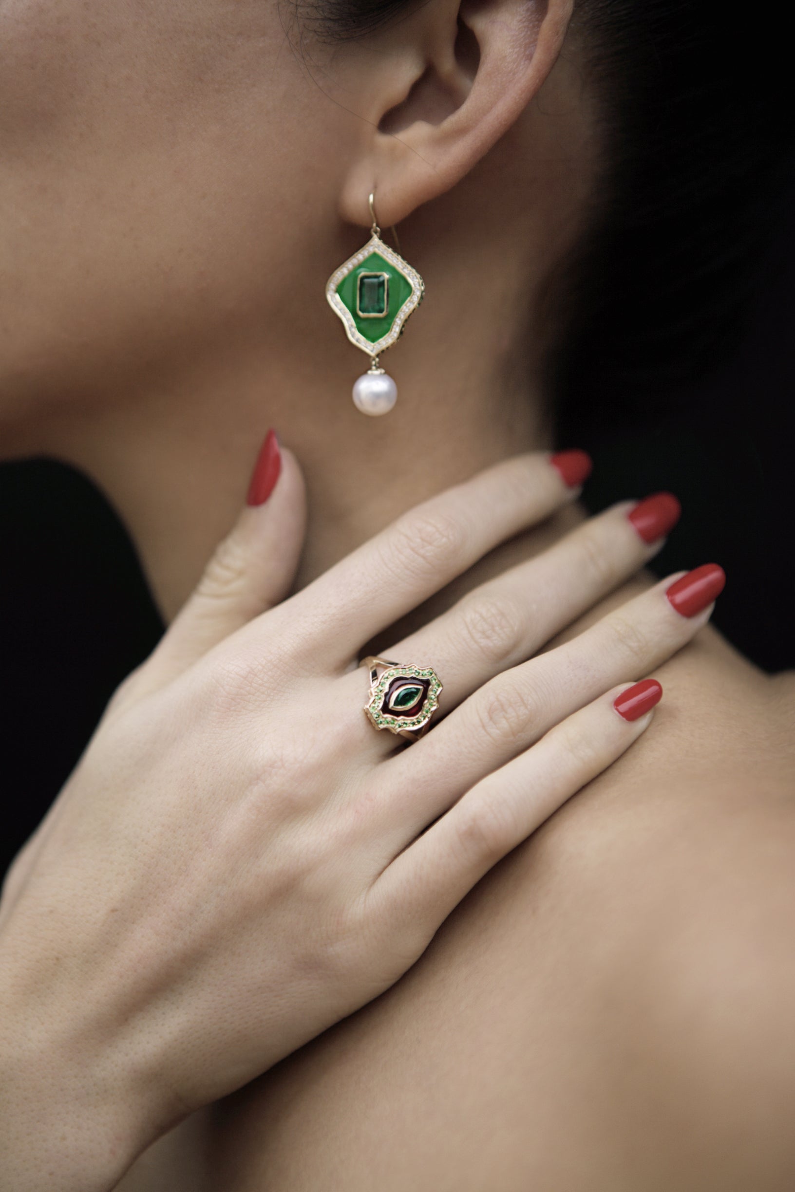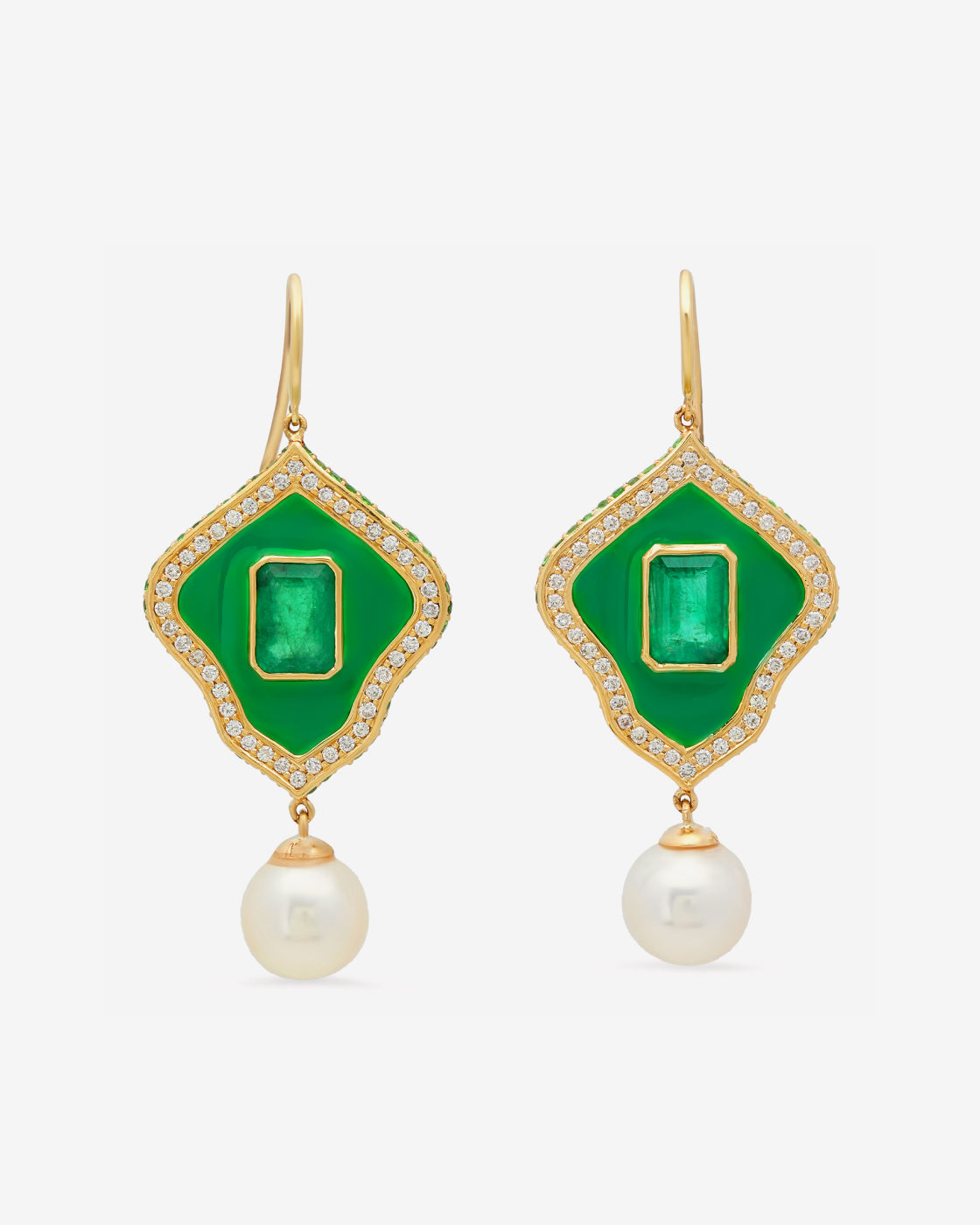 The Savas Earring is part of the Sultana Collection, inspired by the old world Byzantine and Ottoman empires. Designed to immortalize Old World intricacies with vibrant emeralds and tonal enamel.