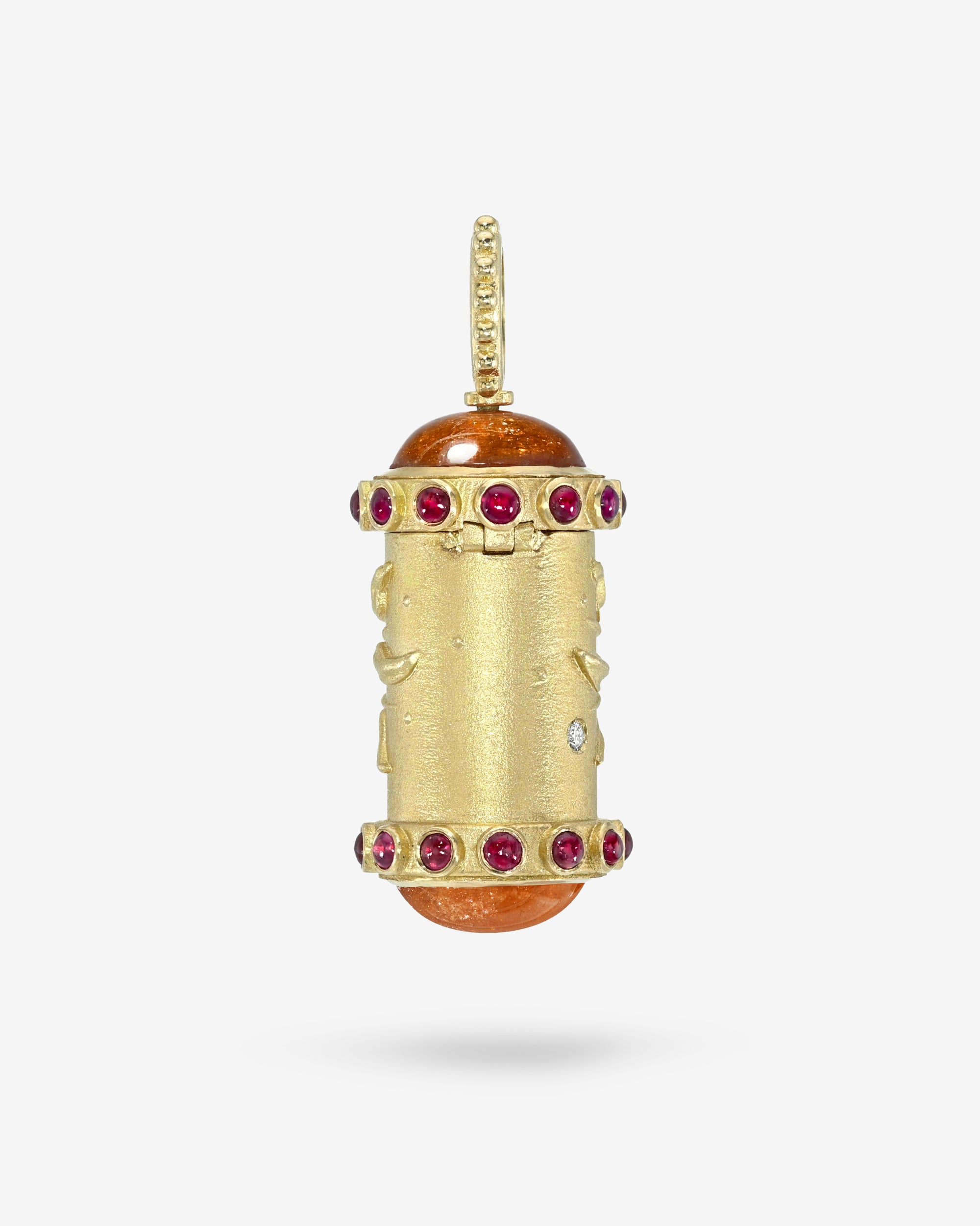 Golden orange sunstone crowns each end, long revered for its connection to light, vitality, and leadership. A halo of ruby cabochons encircle the form, stones believed to guard the heart and kindle enduring love.