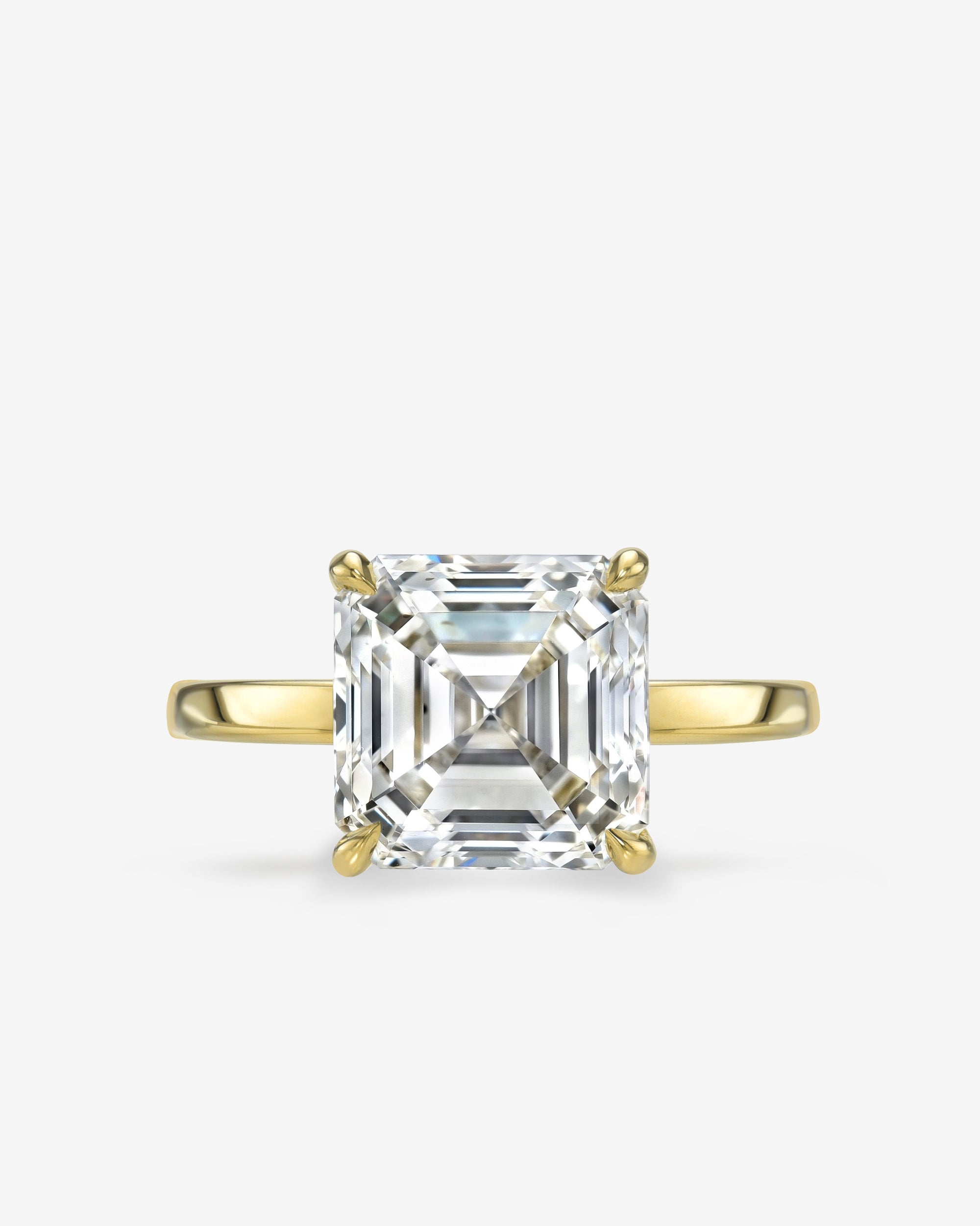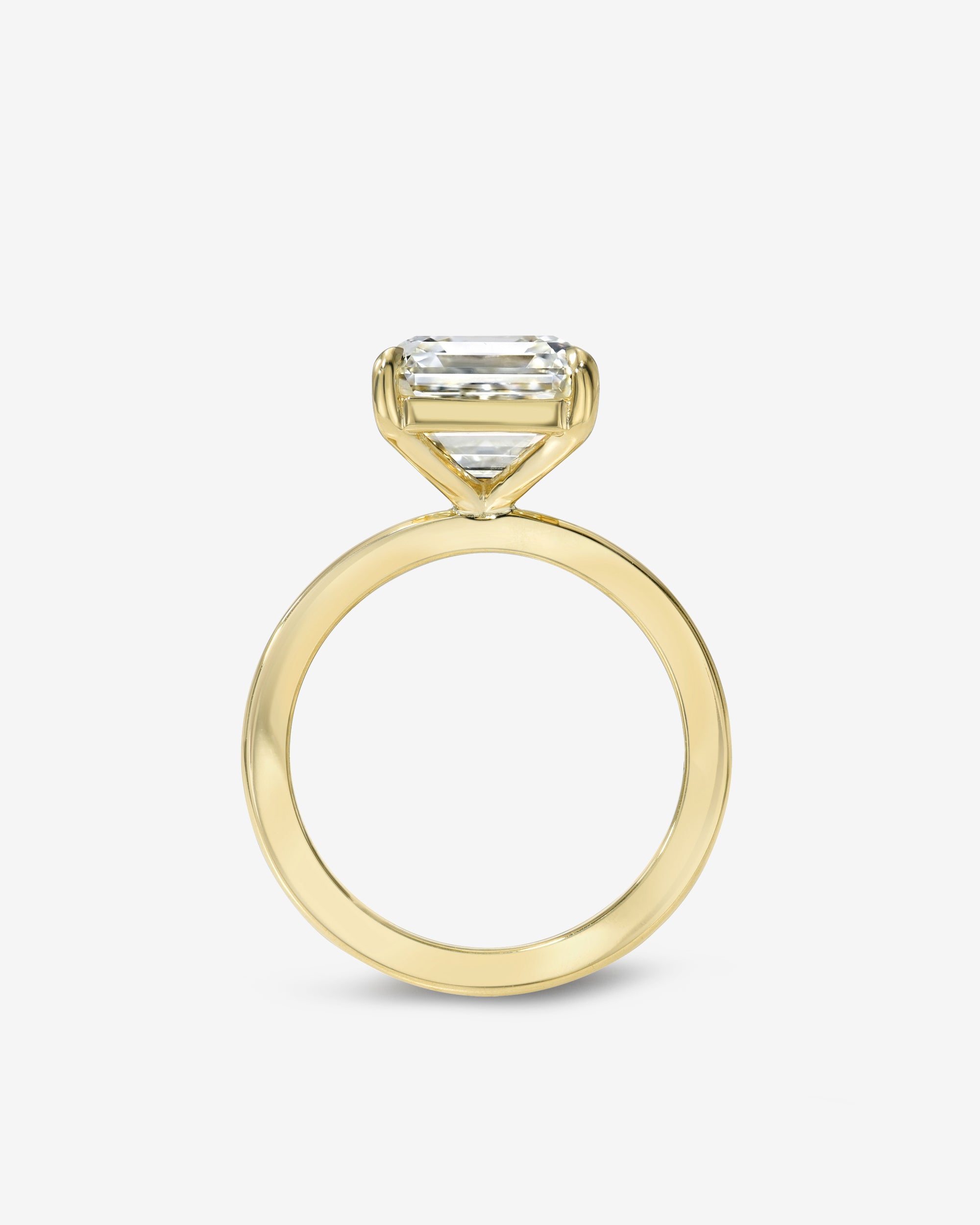 The KCS Amalfi Engagement Ring features a center solitaire diamond with an open basket setting on a thin band. Pictured here with a 3 carat asscher cut diamond set in yellow gold.