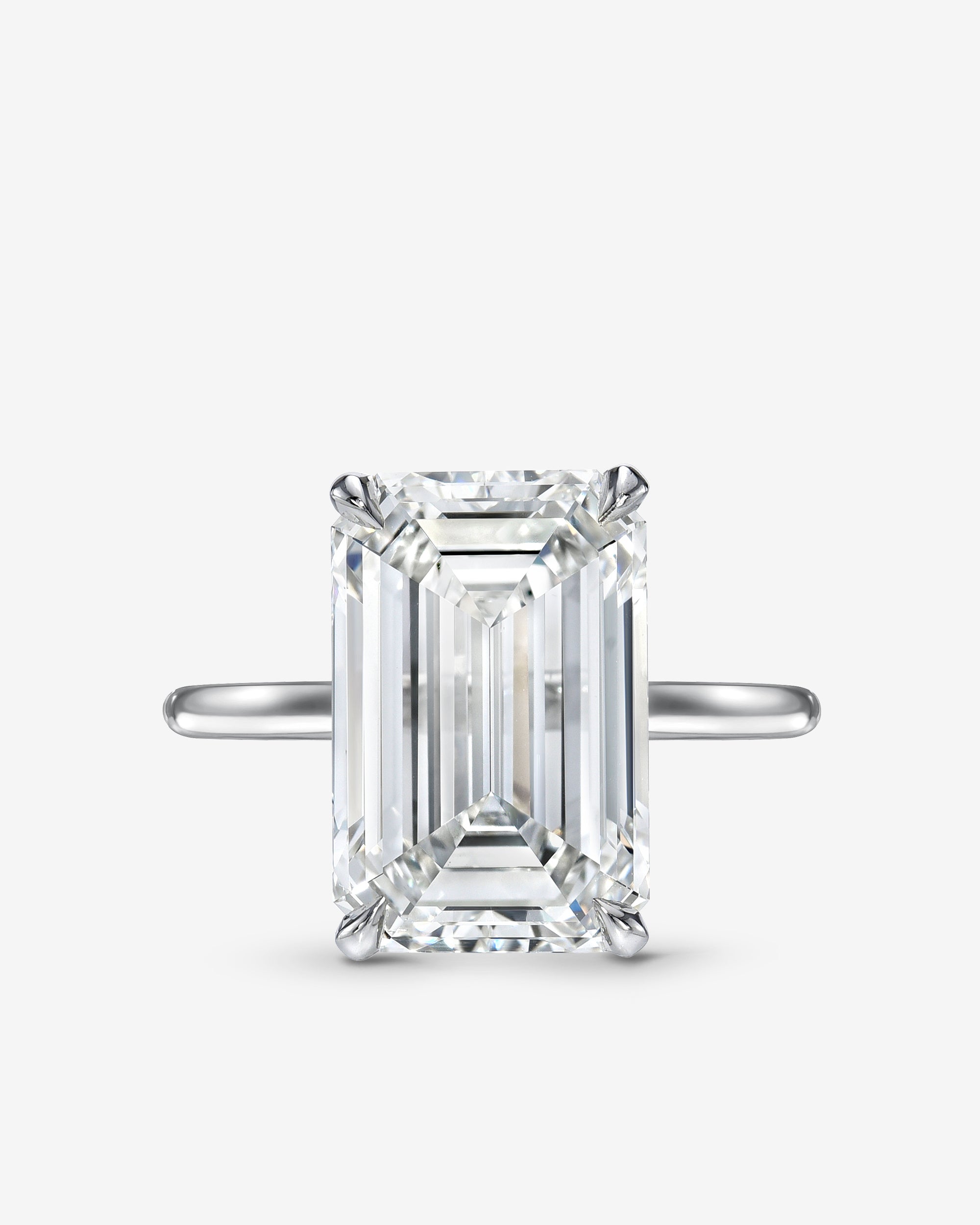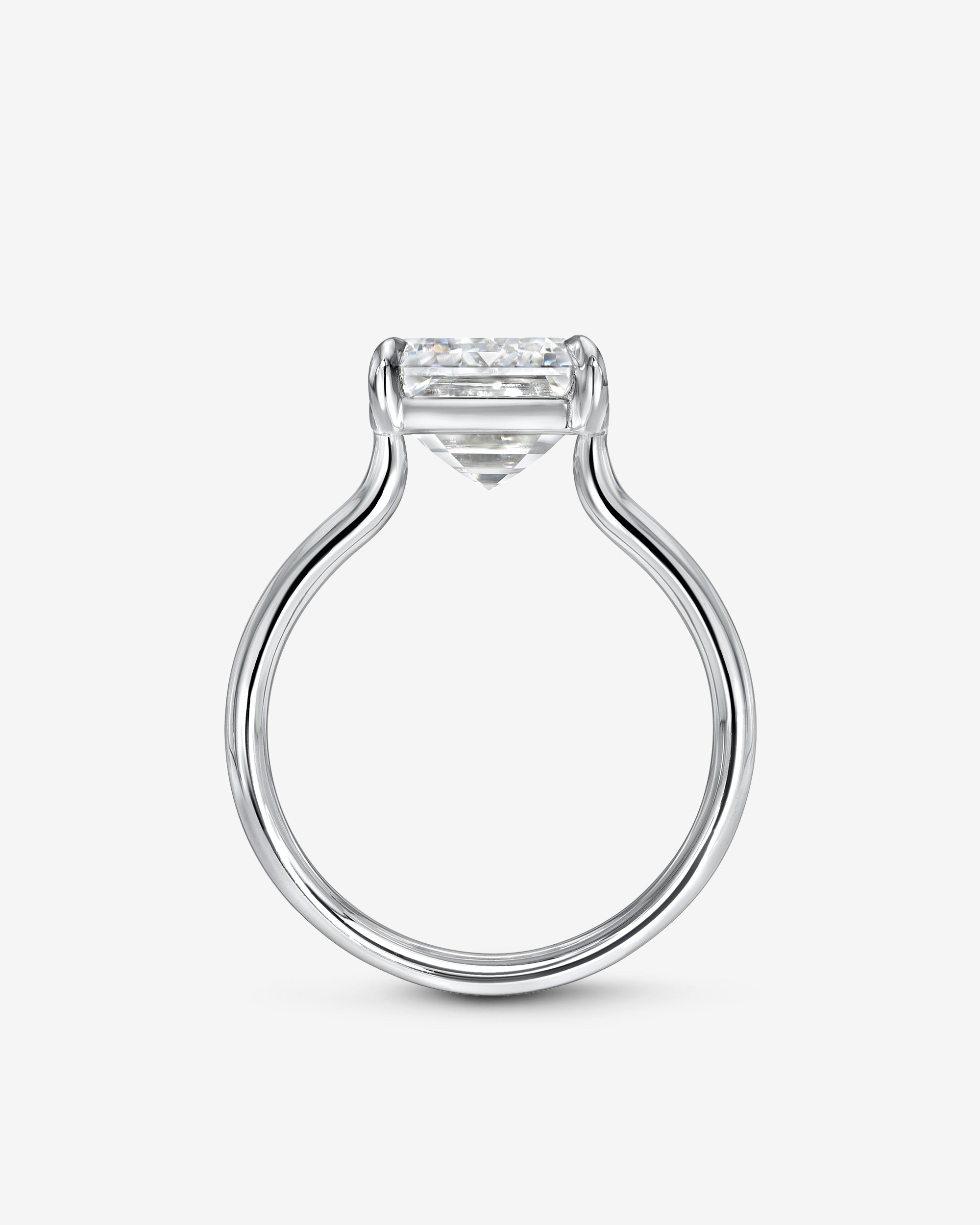 Minimal and modern, the Aspen engagement ring features and floating center stone and open band. Choose this setting for its delicate and chic lines which allow the center stone to shine. Pictured here with an emerald cut set in platinum.