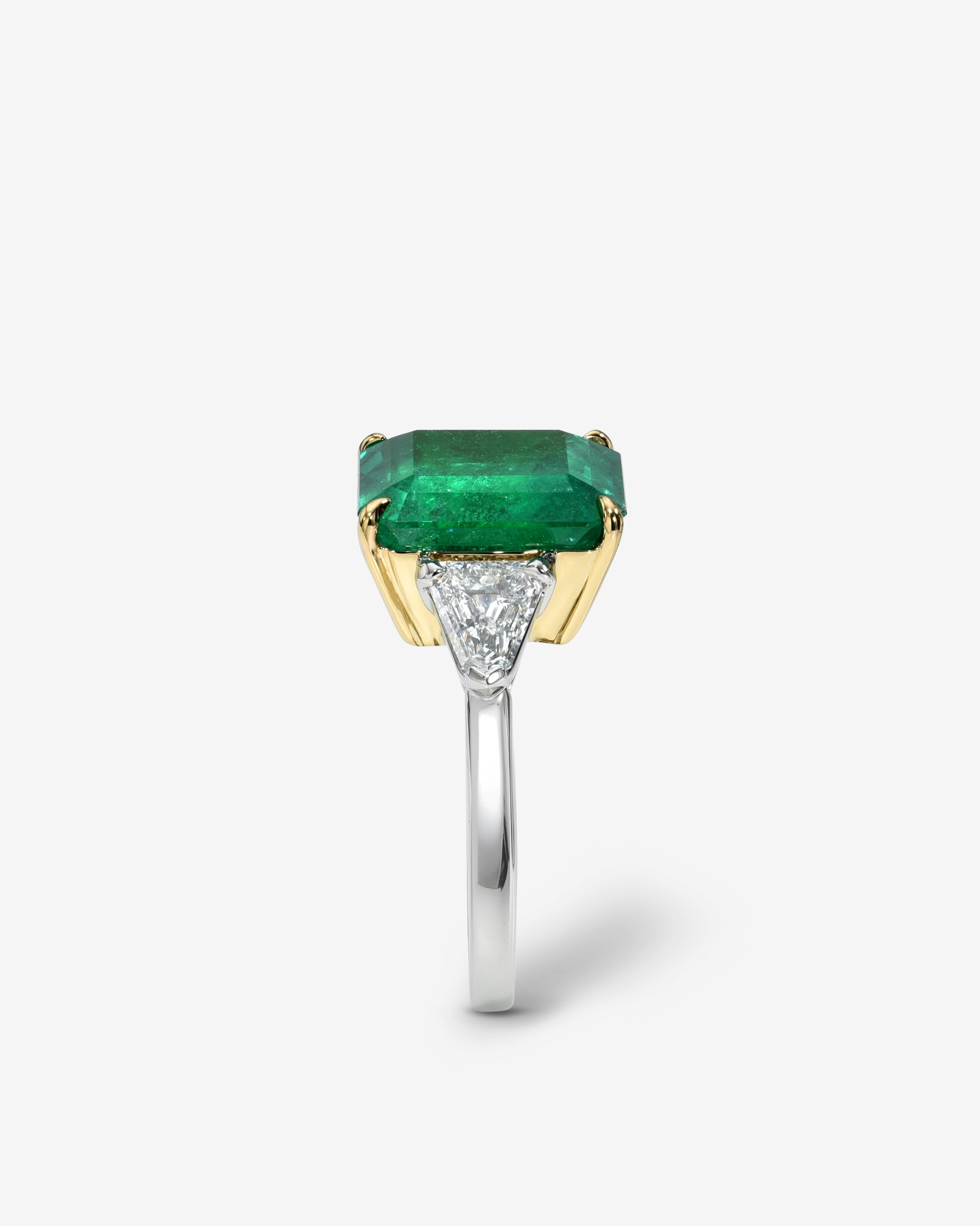 The KCS Biarritz Engagement Ring features a center Emerald flanked by step cut side stones on a delicate band. Pictured here with a 6 carat Emerald set in 18k yellow gold and platinum.