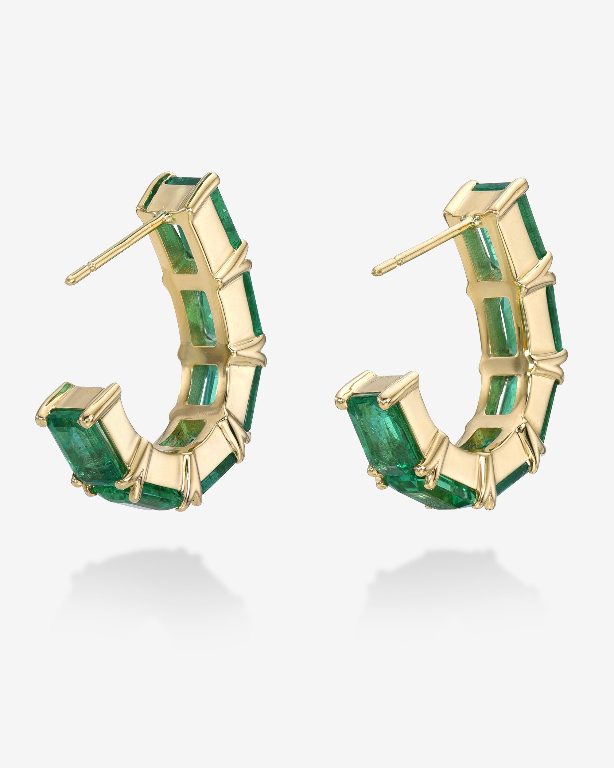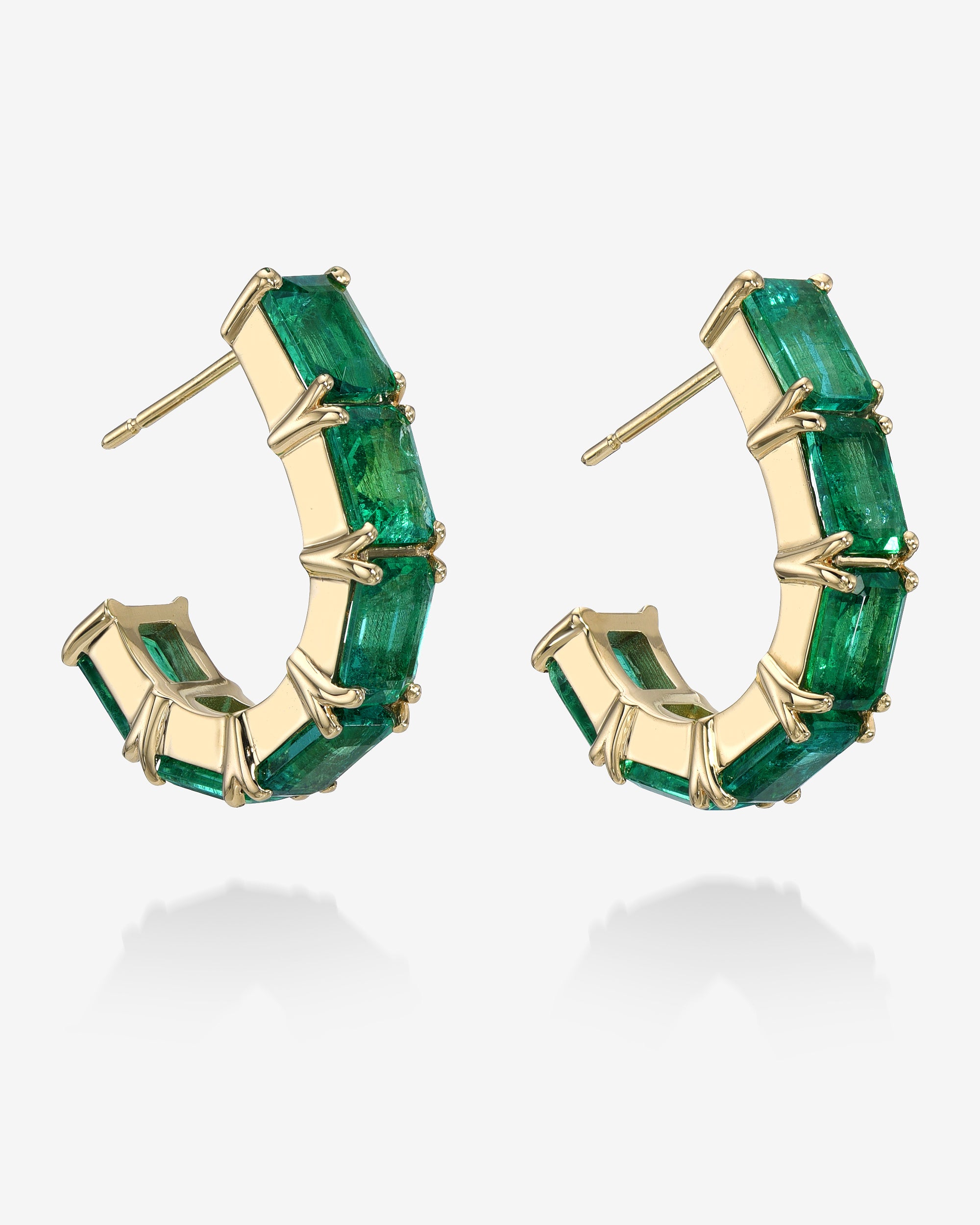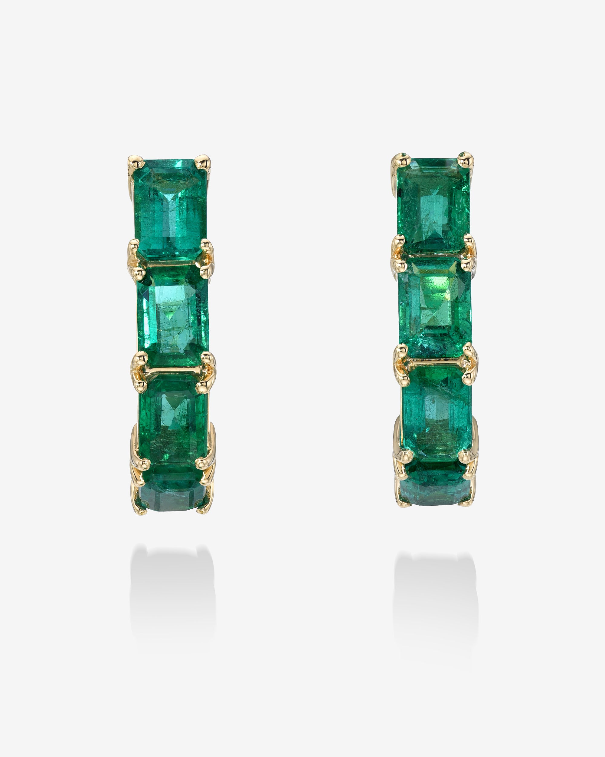 Our iconic emerald half hoops featuring natural green emeralds