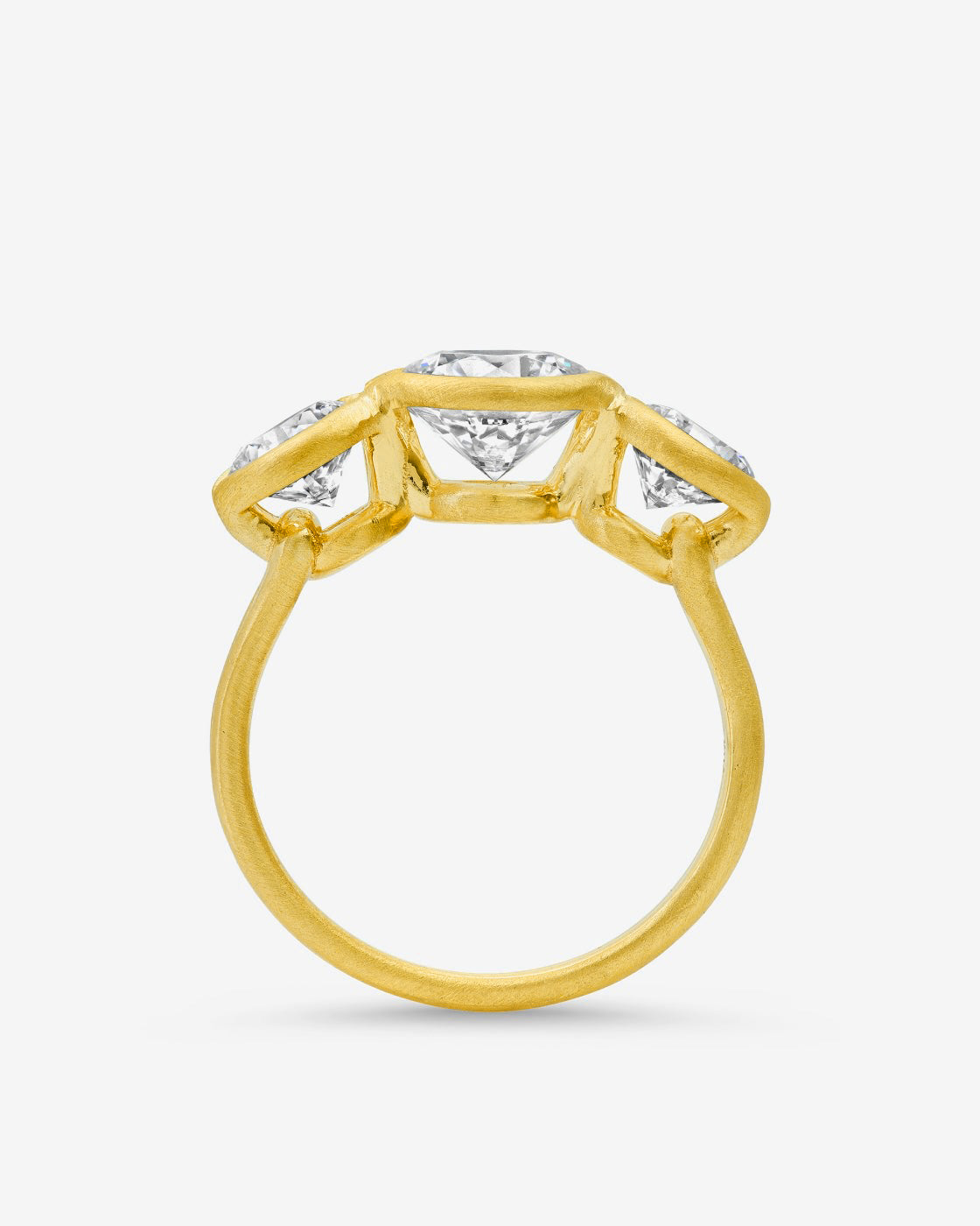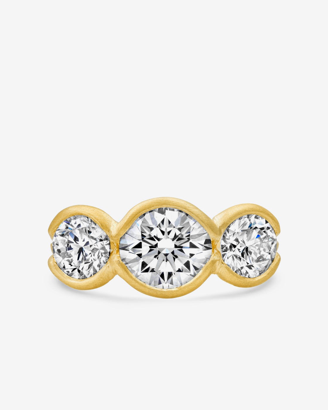 A take on a classic three stone ring. Floating bezels showcase the beauty of the diamonds within, set in our signature satin finish gold.