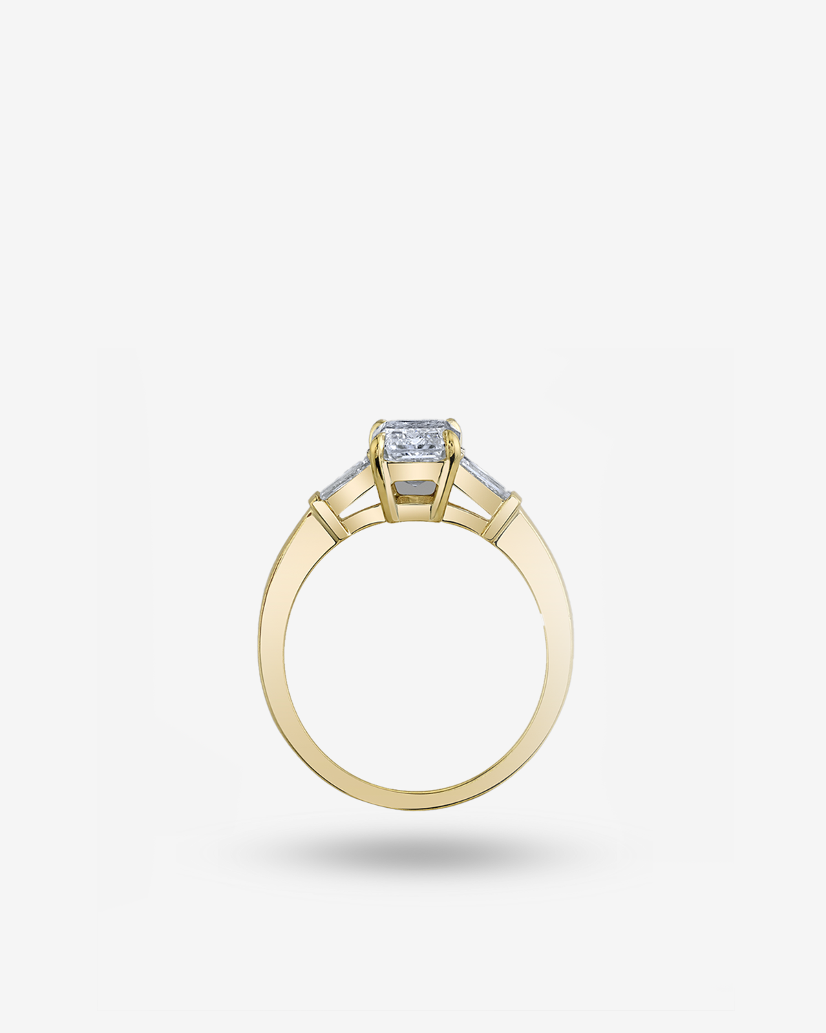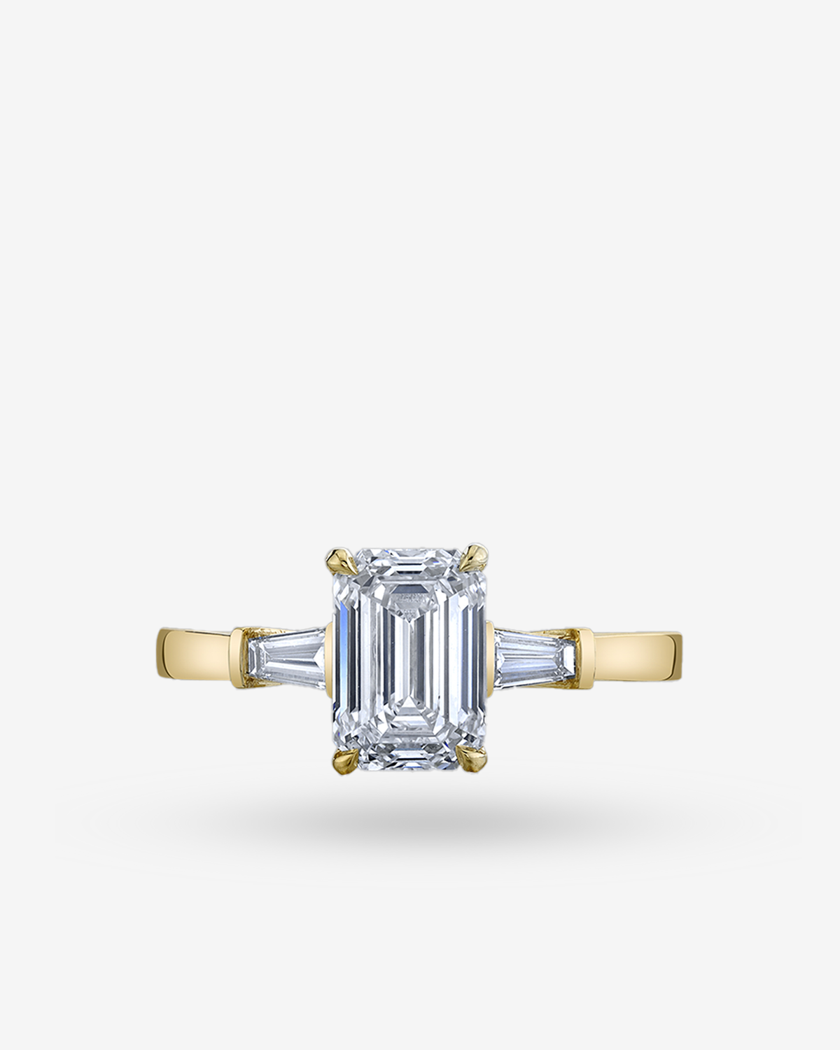 The KCS Kensington Engagement Ring features a center diamond with diamond tapered baguettes side stones. Pictured here with an emerald cut diamond set in yellow gold.