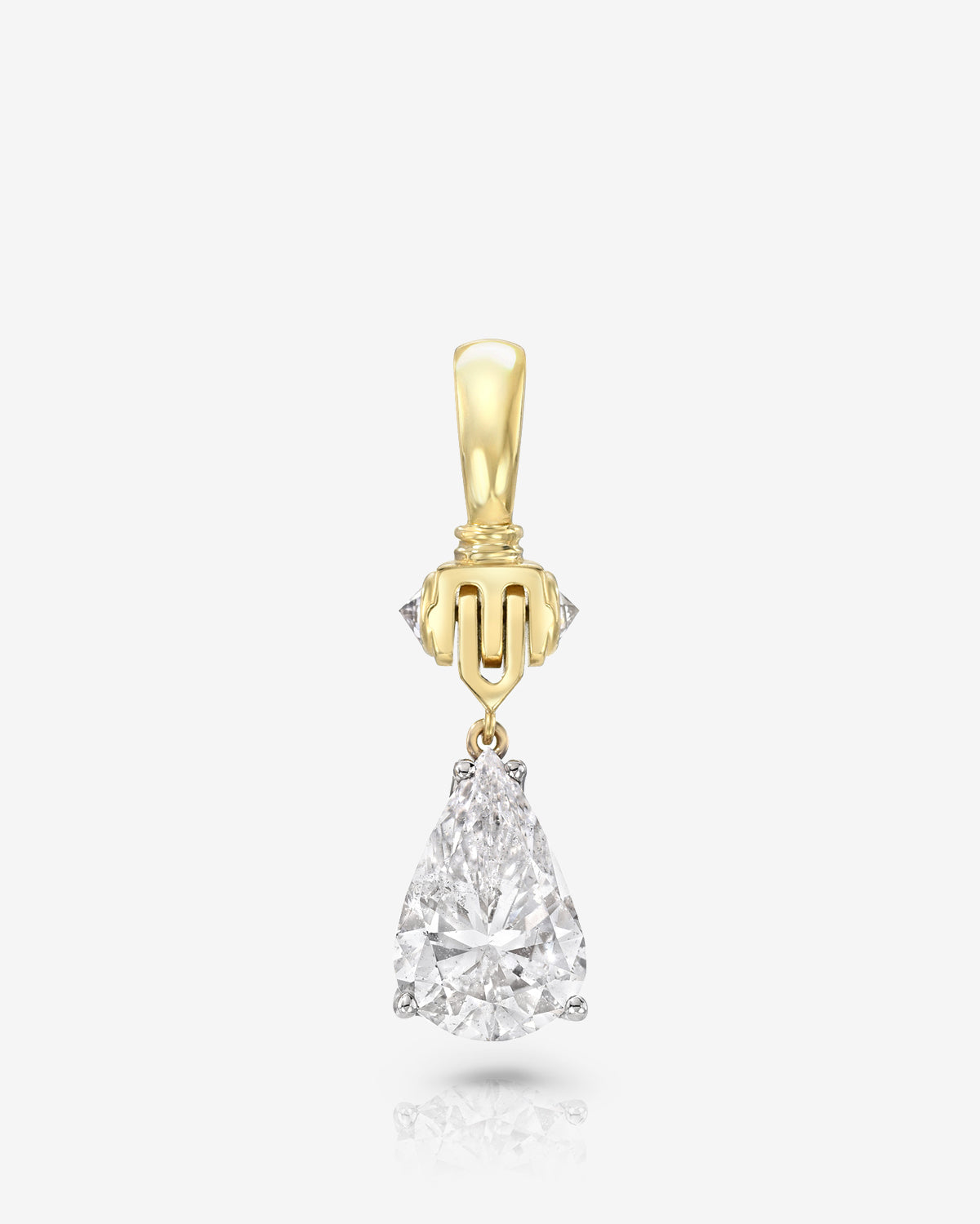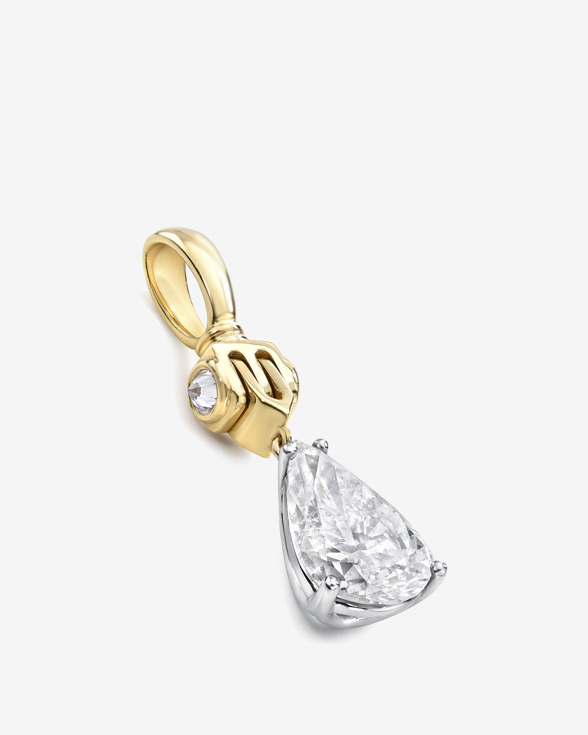 Pear cut diamond set onto a working hinged knocker. Oversized bail to fit on most chains.