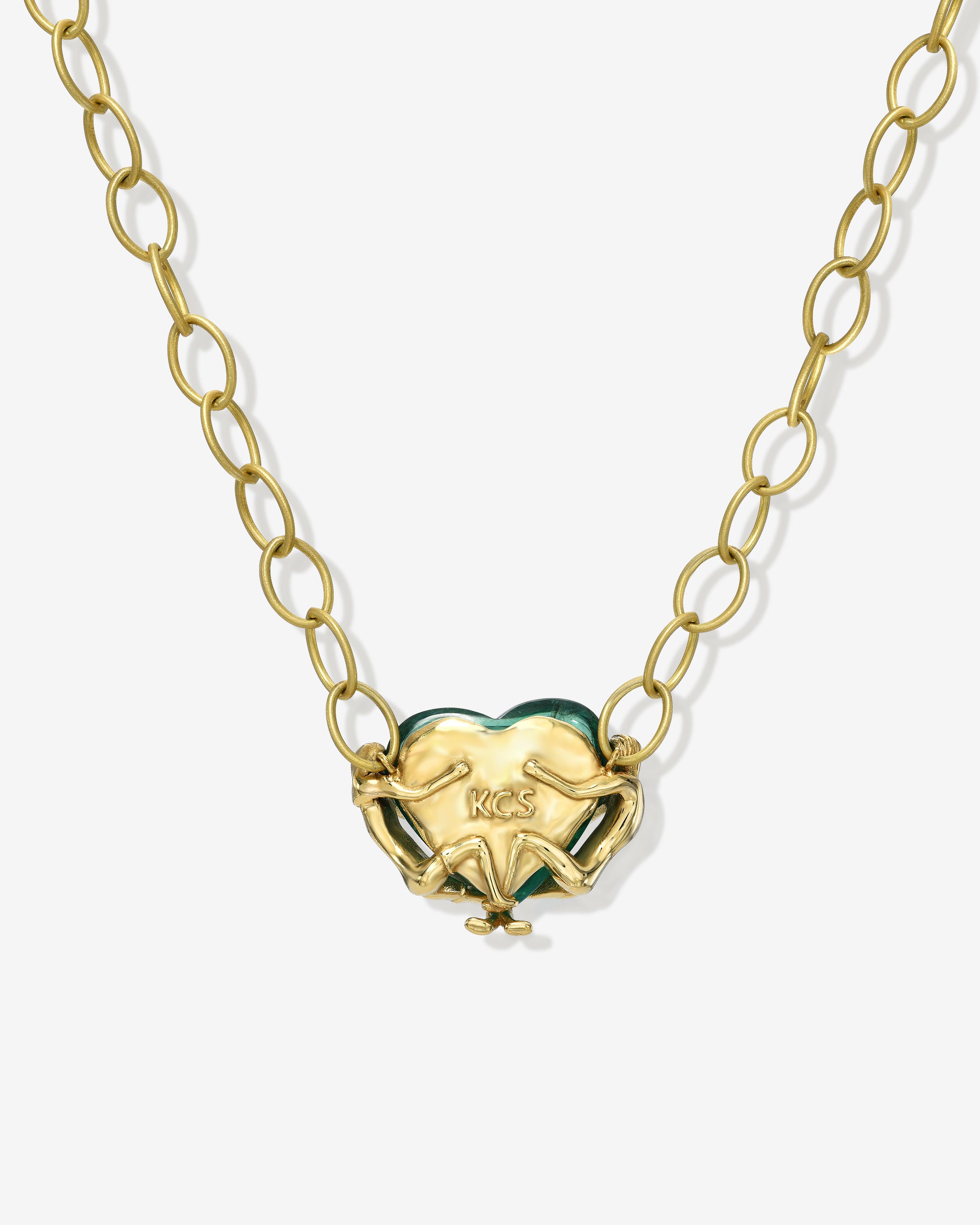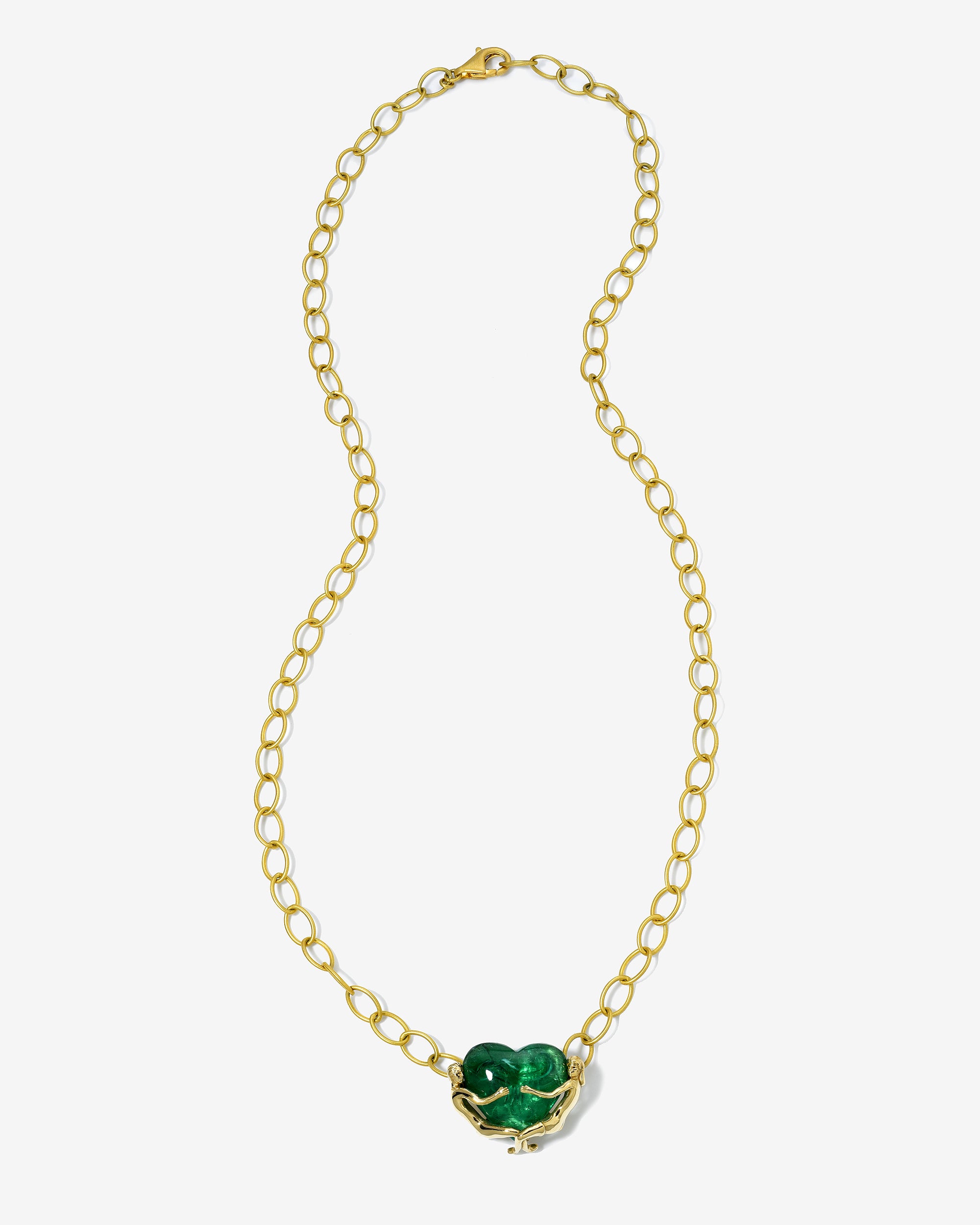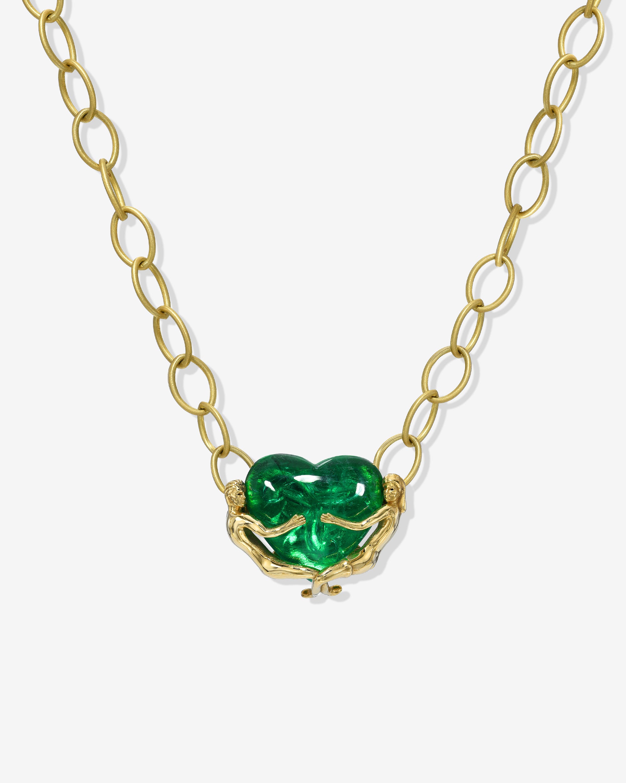 Two lovers join together to hold up a stunning and rare cabochon heart shaped Colombian emerald.