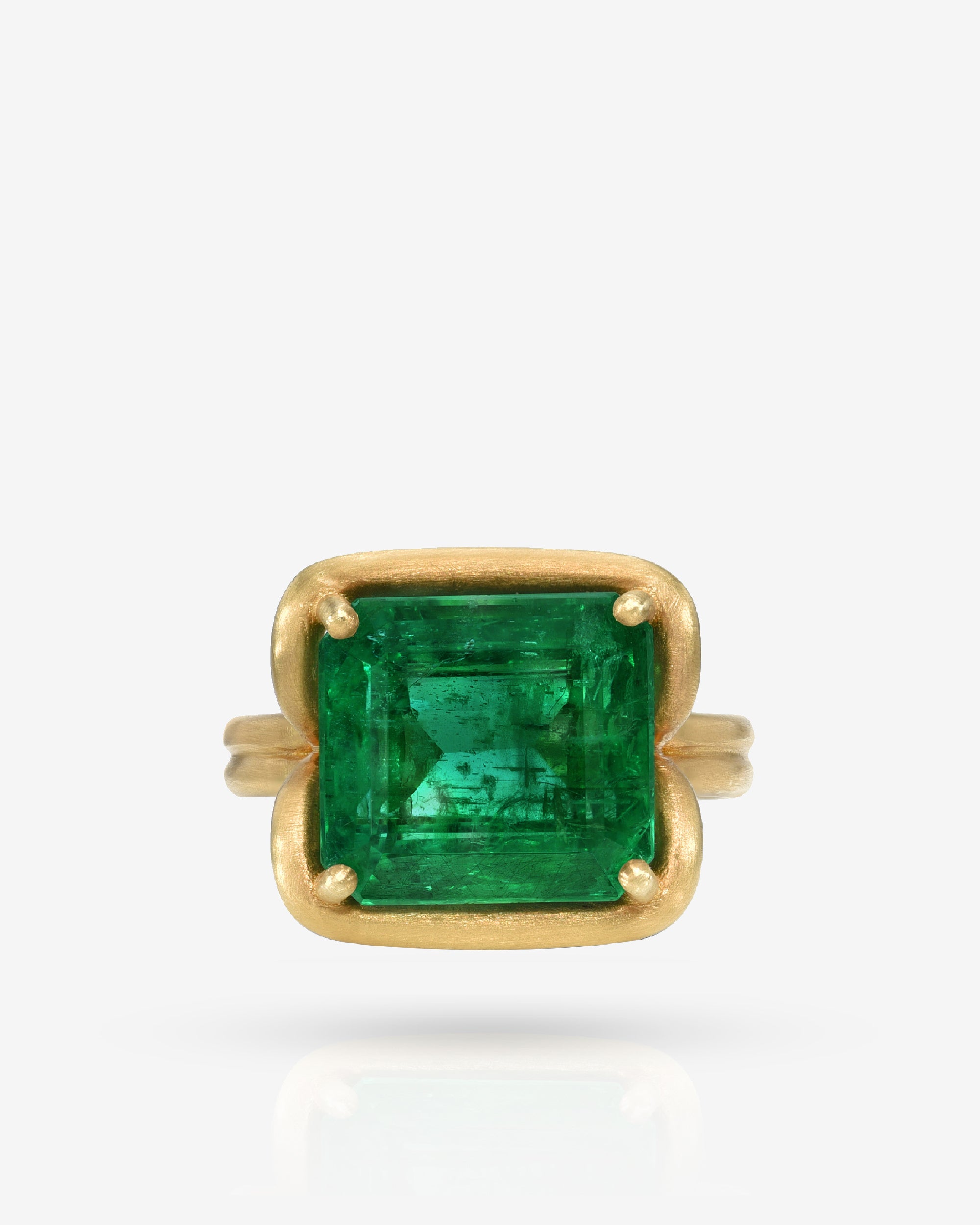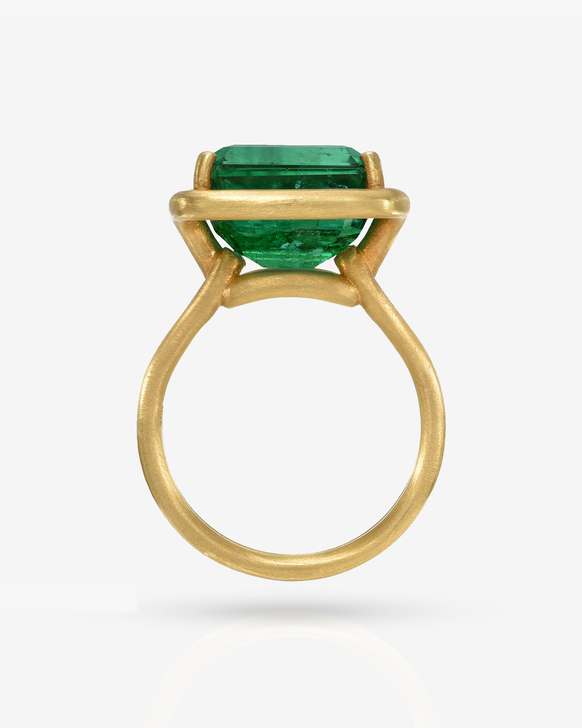 Reminiscent of classic Roman empire adornments, the Treccia, braided basket ring, is an architectural marvel. Hand pulled gold is superior in strength to house the most precious of gems. Finished off with a special sanding technique to give it a matte finish. Pictured here with an 8 carat emerald on 18k yellow gold.