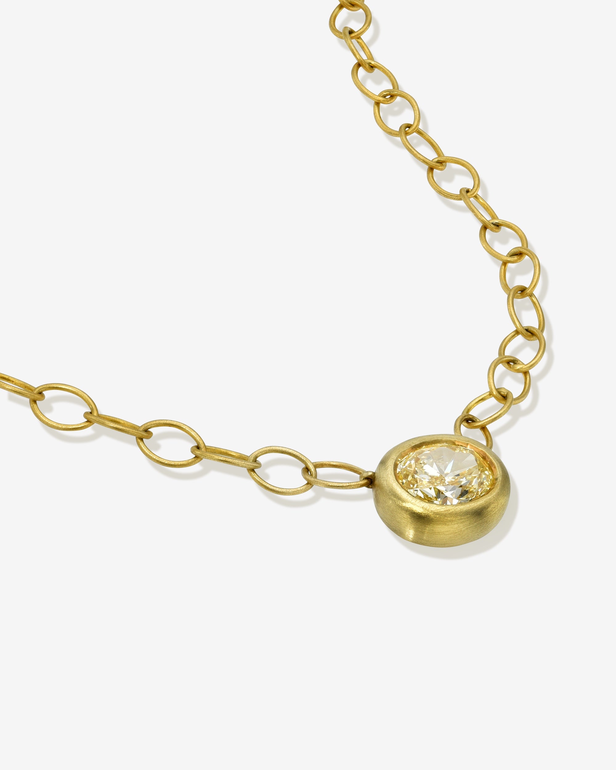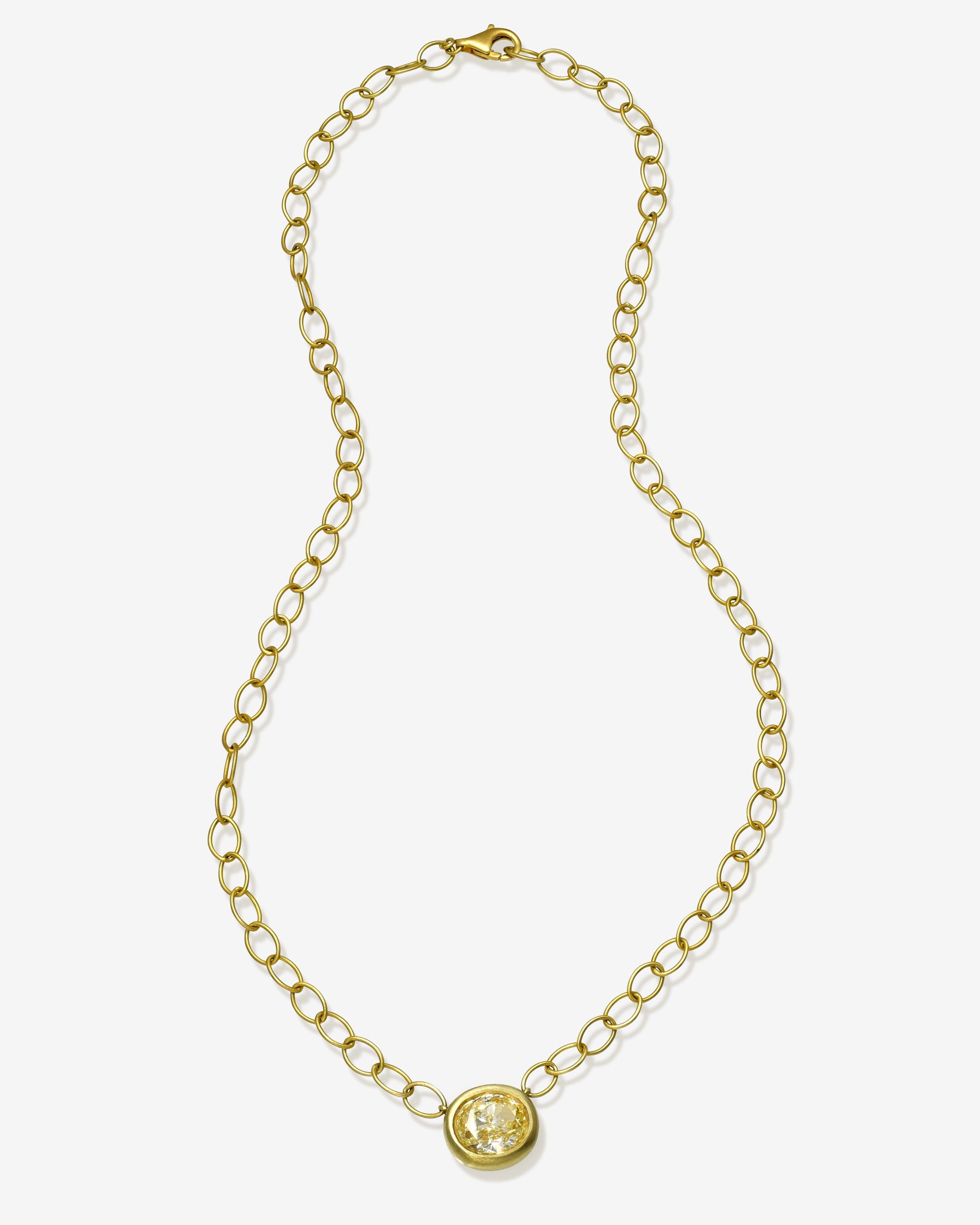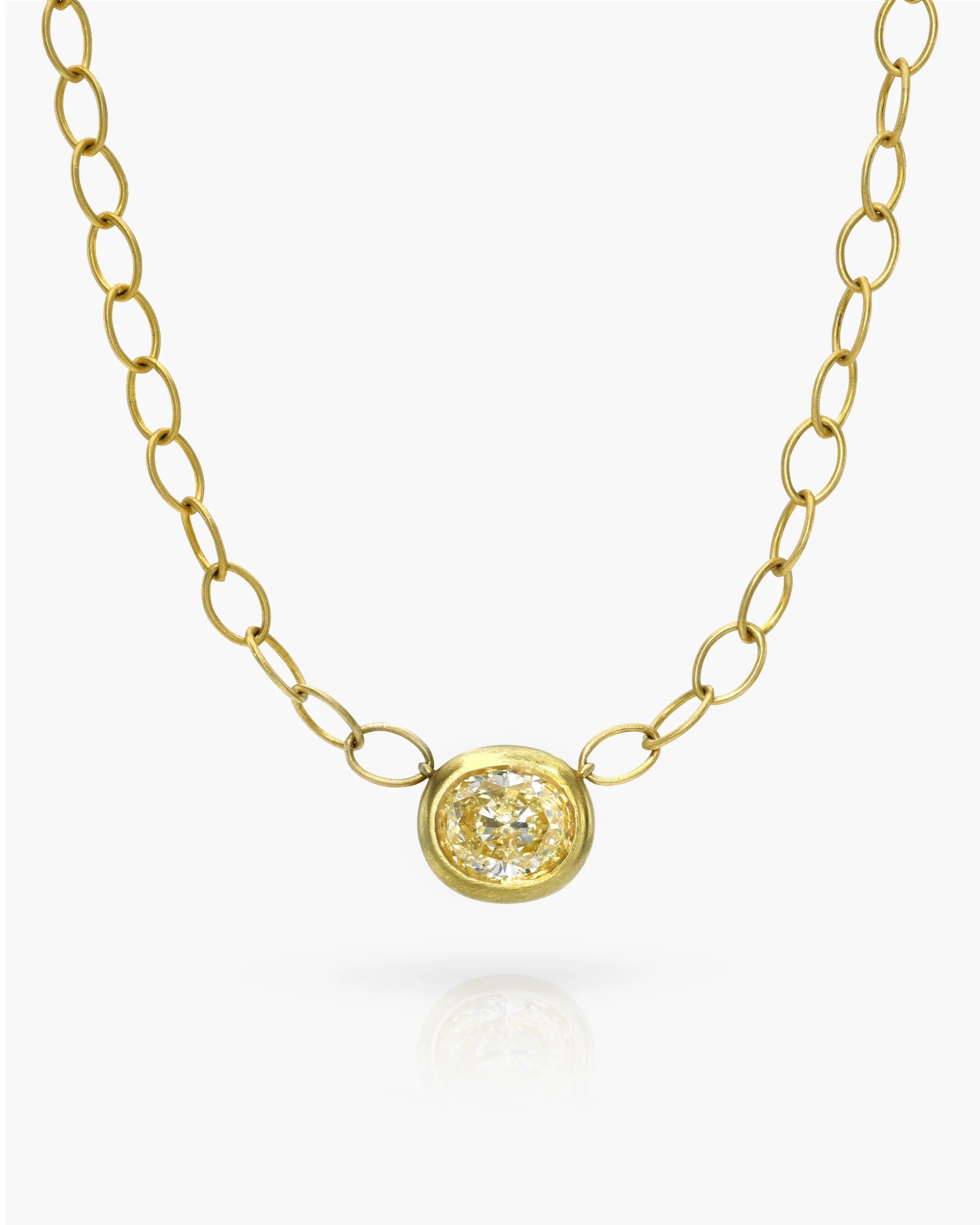 A Fancy Yellow oval diamond, perfectly encased in a stunning bezel and accented with our signature satin finish.